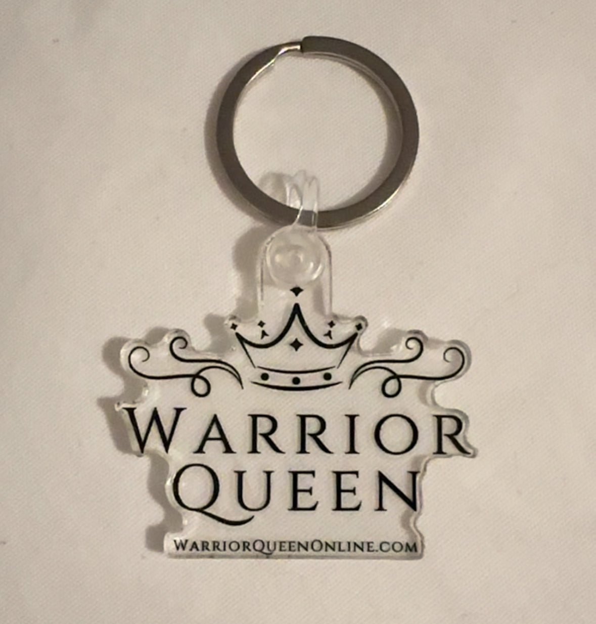 Clear acrylic keychain with Warrior Queen logo. Measures 2"x1.56".